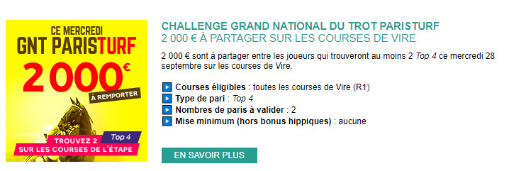Genybet.fr a mis en place une cagnotte de 2000 euros à se partager à l’occasion de ce Challenge ce mercredi 28 septembre 2022. Pour faire partie des heureux parieurs, il vous faut pour cela trouver deux paris Top 4 en réunion I sur l’hippodrome de Vire.