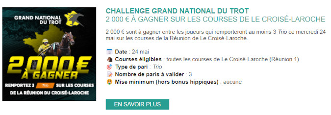 Genybet.fr a mis en place une cagnotte de 2000 euros à se partager à l’occasion de ce Challenge ce mercredi 24 mai 2023. Pour faire partie des heureux parieurs, il vous faut pour cela trouver trois paris Trio en réunion I sur l’hippodrome du Croisé-Laroche.
