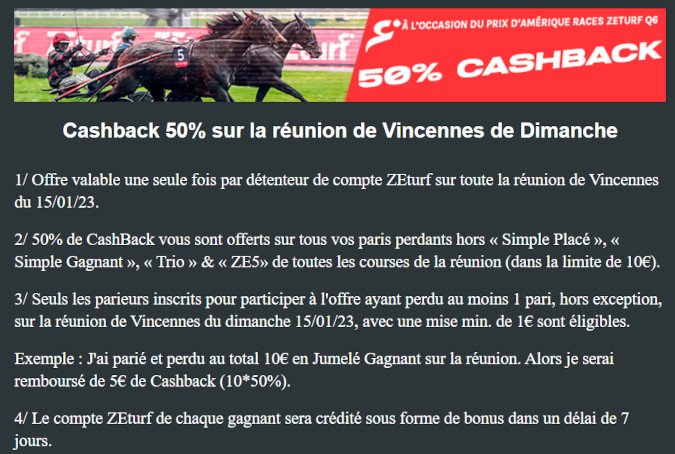 Un Cashback à hauteur de 50% a été mis en place par Zeturf à l’occasion du Prix de Belgique. Cette offre mise en place par Zeturf concerne tous les jeux que vous allez effectuer durant la journée du dimanche 15 janvier 2023. Tous vos paris hors jeu simple gagnants ou placés, trio et Z5 perdants sur la réunion I à Vincennes seront remboursés à hauteur de 50%. Cette offre est valable dans la limite de 10 euros par compte. Cela vous permet d’éponger une partie de vos pertes et récupérer une petite somme intéressante en cas d’échecs dans certaines courses.