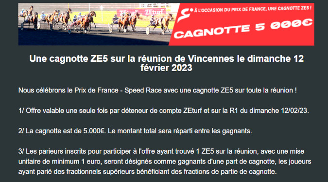 Un Cashback à hauteur de 5 euros a été mis en place par Zeturf à l’occasion du Prix de France. Cette offre mise en place par Zeturf concerne tous les jeux que vous allez effectuer sur Vivid Wise As ce dimanche 12 février 2023. Tous vos paris simple gagnants ou placés et Jumelés gagnant ou placés perdants sur le Prix de France Speed Race à Vincennes seront remboursés si le partenaire de Matthieu Abrivard ne finit pas à l’arrivée. Cette offre est valable dans la limite de 5 euros par compte. Cela vous permet de jouer le tenant du titre en toute sécurité dans ce Groupe I.