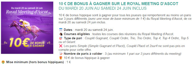 Toujours très attendu par les passionnés de courses de plat, le Royal Meeting d’Ascot va débuter ce mardi 20 juin 2023 et Genybet est déjà sur le coup. L’opérateur hippique va profiter de ces prochains jours pour mettre en place une promotion pour célébrer des courses hippiques de grande qualité et qui suscitent énormément de ferveur Outre-Manche. Avec plusieurs champions au départ des différents Groupe I, un spectacle de toute beauté nous est promis. Dans cette optique, et sachant que la prise de paris sur ces différentes épreuves est possible en France, Genybet vous propose de remporter 10 euros à l’occasion de ce mini meeting de 5 jours.